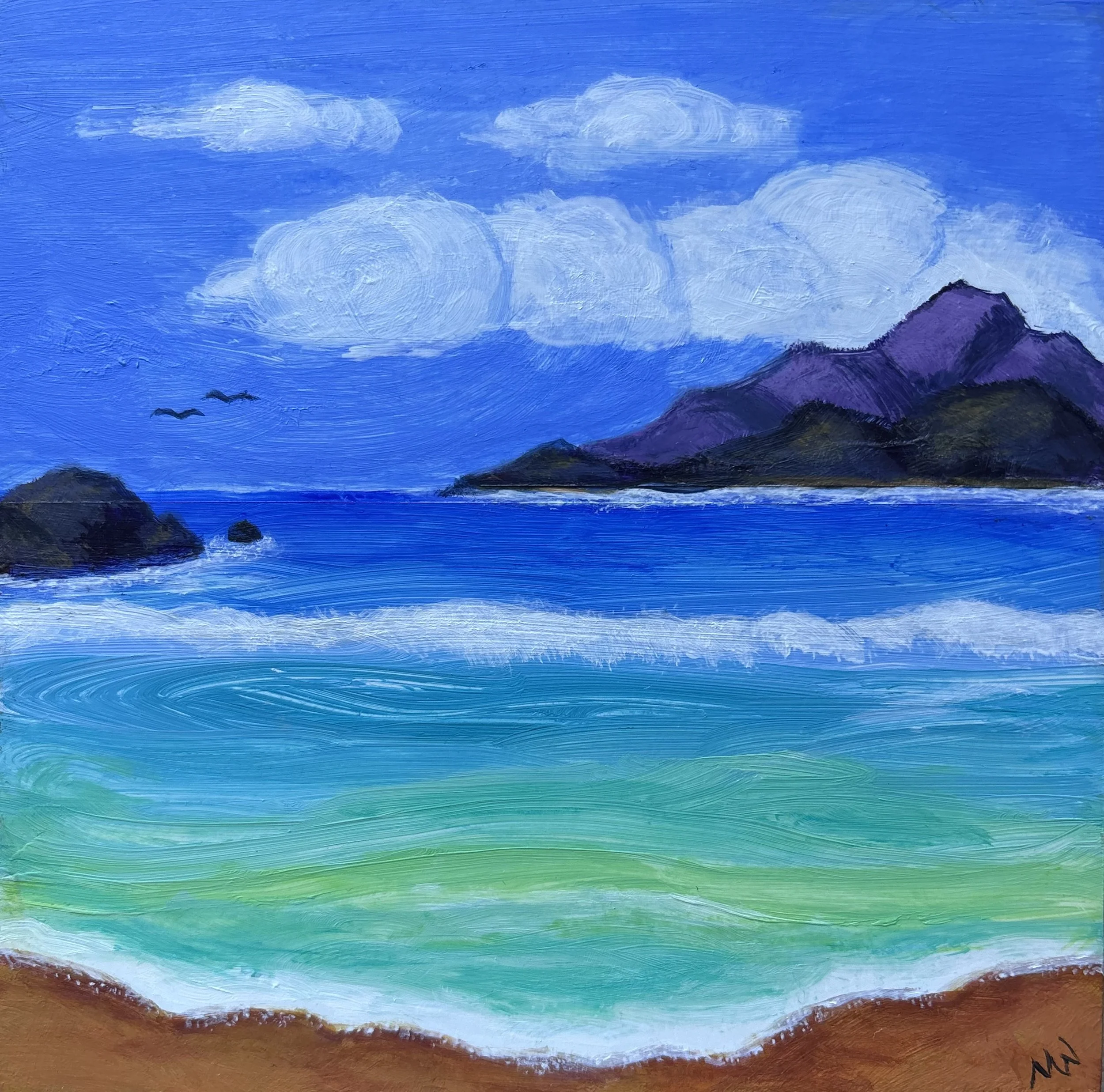 This is my 6” x 6” acrylic painting on a cradle board, titled ‘Pelican Bay’.